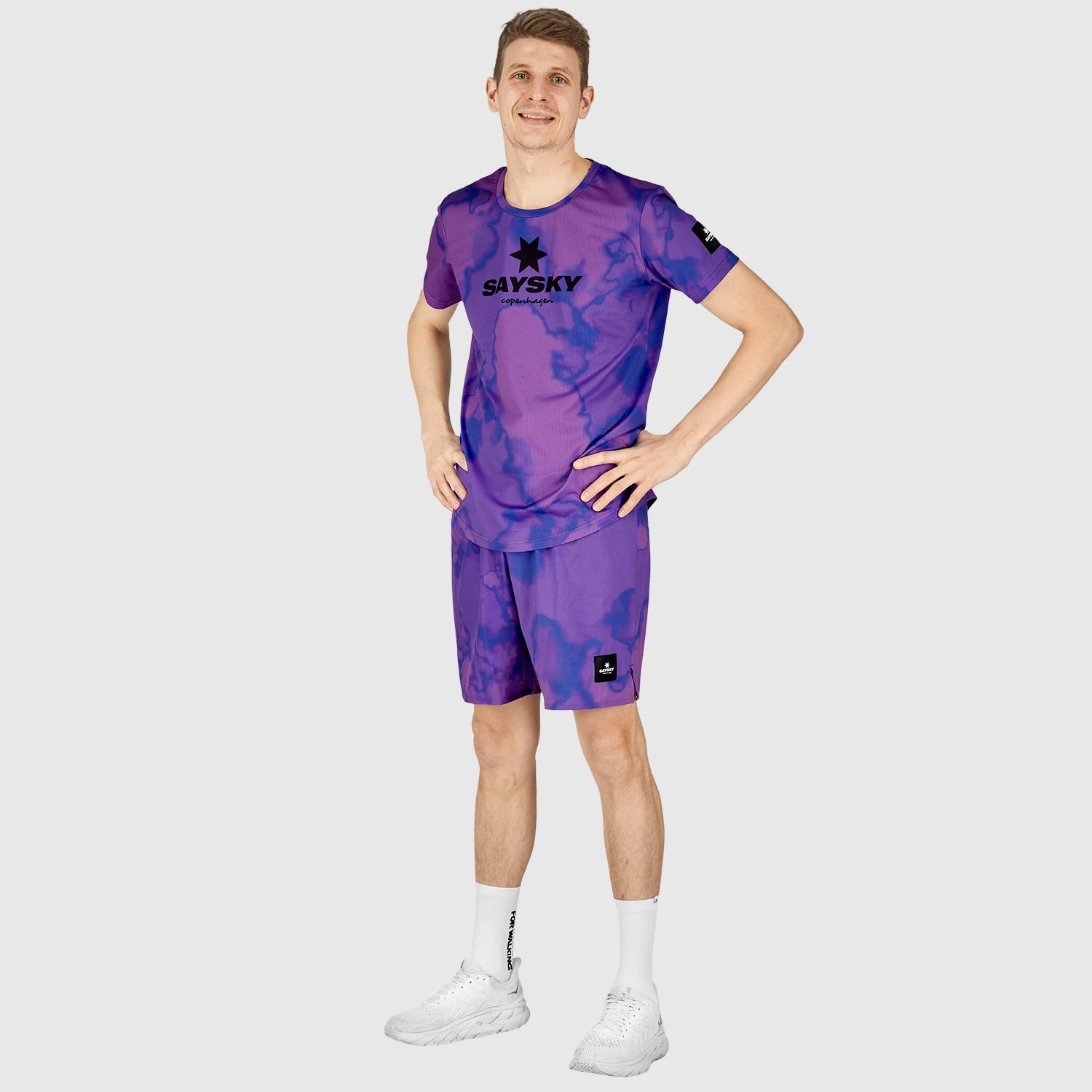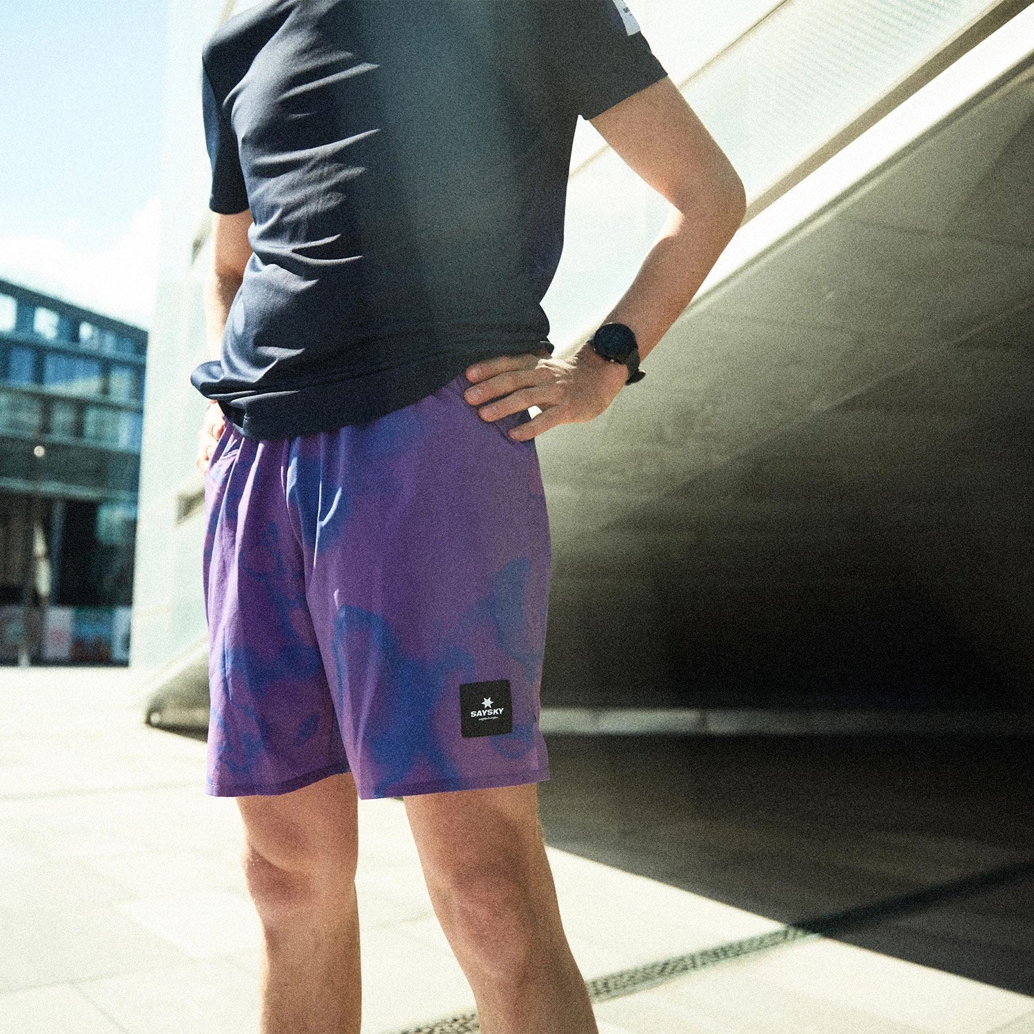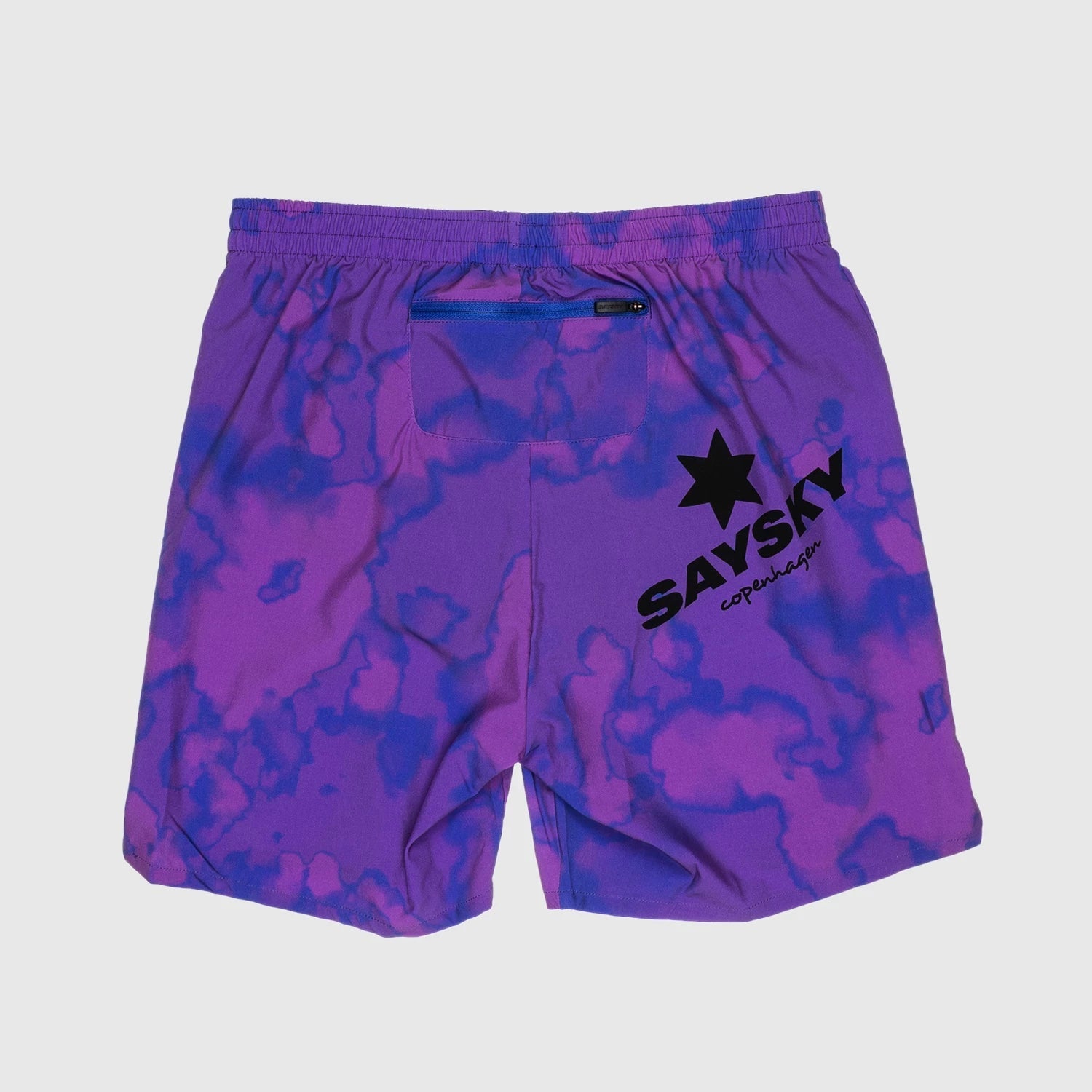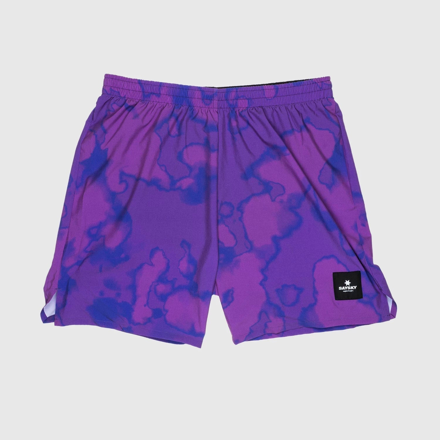 SAYSKYのトキシティペースショーツはクラシックなタイプの6インチ(15cm)・ランニングショーツです。通常のPaceショーツよりも少し長い仕様になっており、サイドにスリットが入っています。超軽量で通気性に長けたファブリックを使用し、レギュラーフィットのハイパフォーマンス仕様です。パープルカラーのタイダイ柄プリントのショーツで、フロント裾にはブラックのSAYSKYロゴパッチ付き、バックサイドにはブラックのクラシックなSAYSKYロゴをデザインしています。