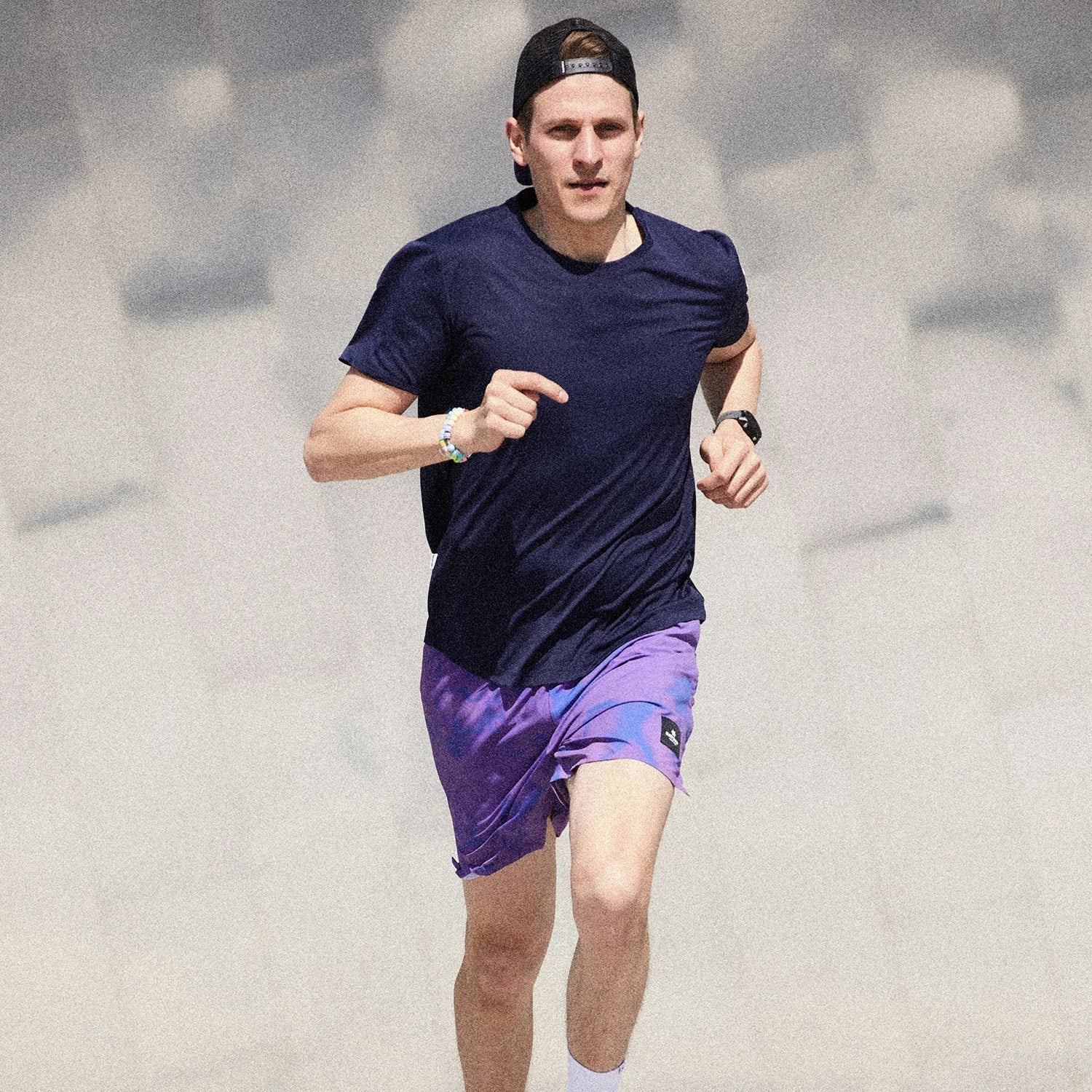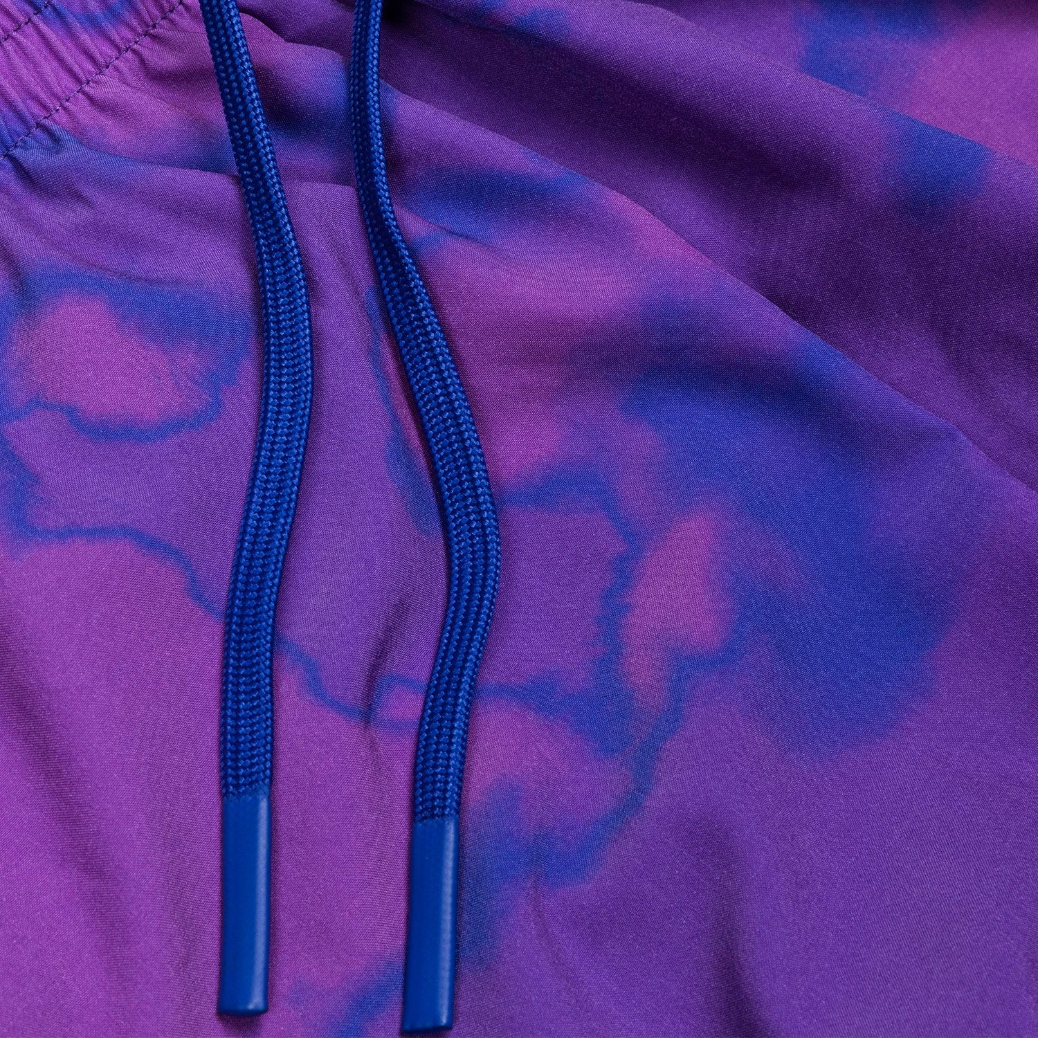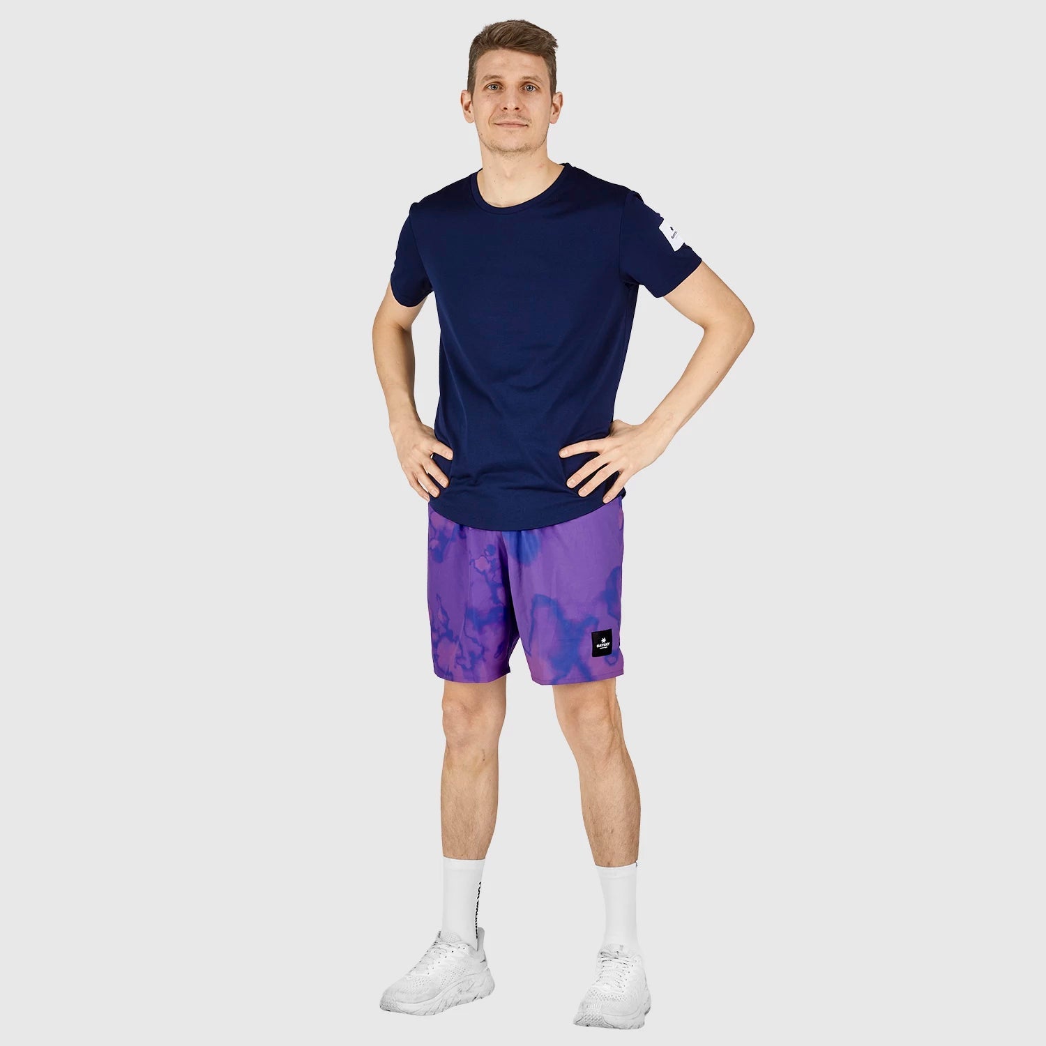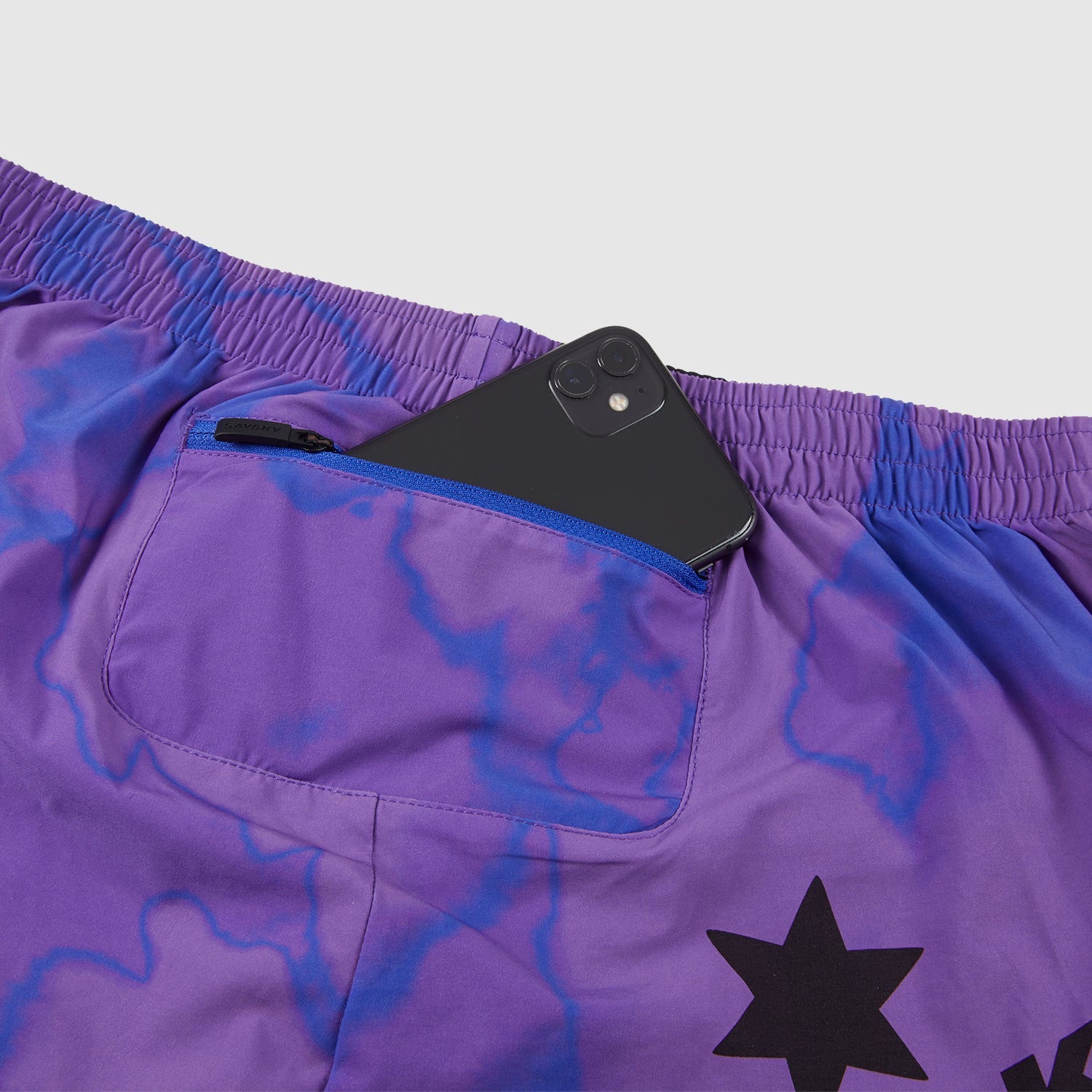 SAYSKYのトキシティペースショーツはクラシックなタイプの6インチ(15cm)・ランニングショーツです。通常のPaceショーツよりも少し長い仕様になっており、サイドにスリットが入っています。超軽量で通気性に長けたファブリックを使用し、レギュラーフィットのハイパフォーマンス仕様です。パープルカラーのタイダイ柄プリントのショーツで、フロント裾にはブラックのSAYSKYロゴパッチ付き、バックサイドにはブラックのクラシックなSAYSKYロゴをデザインしています。