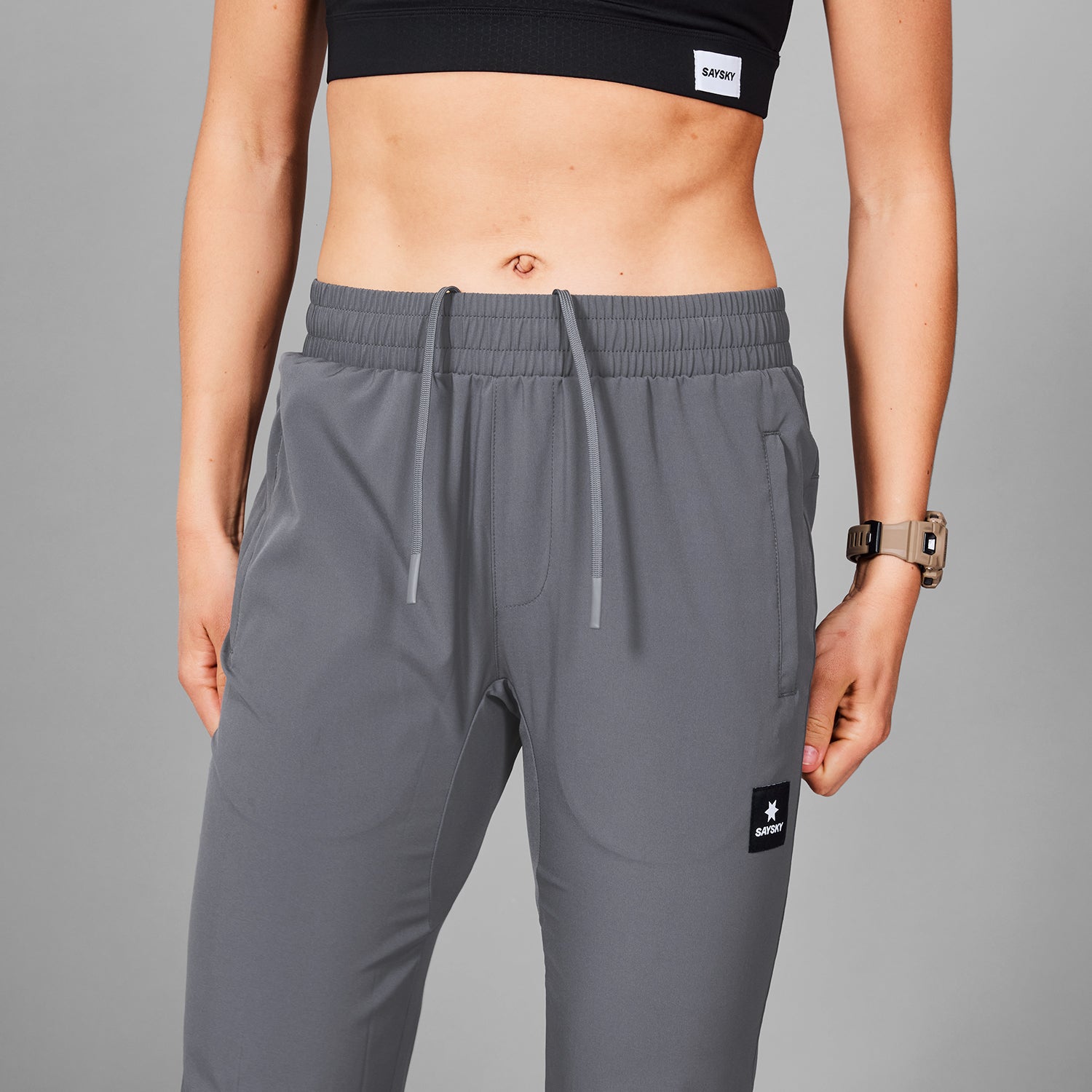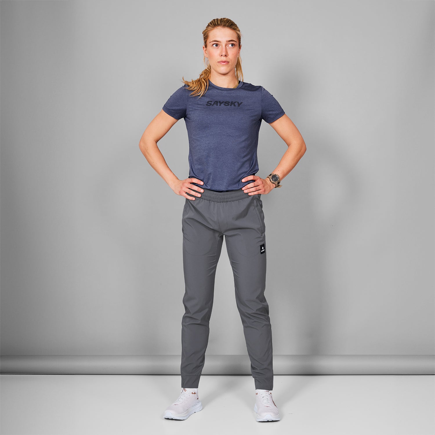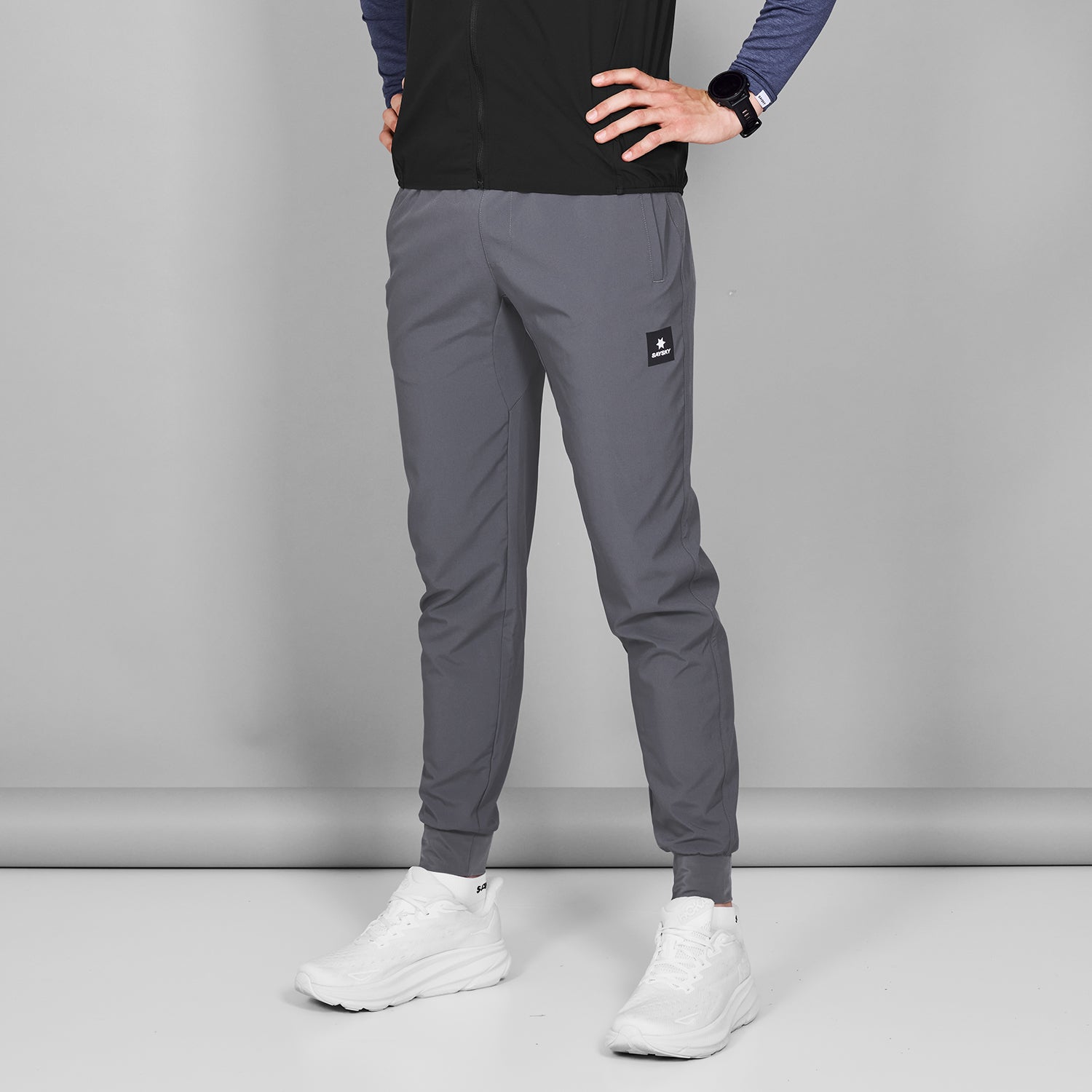 SAYSKYのPace Pantsはランニングで速く走るために、そして外出先でかっこよく見えるようにデザインされた、カジュアルなランニングパンツです。膝から足首の袖口にかけて細くフィットするユニセックスデザインのパンツです。カラーはグレーで、太ももとバックサイドにはブラックカラーのSAYSKYラベルが施されています。