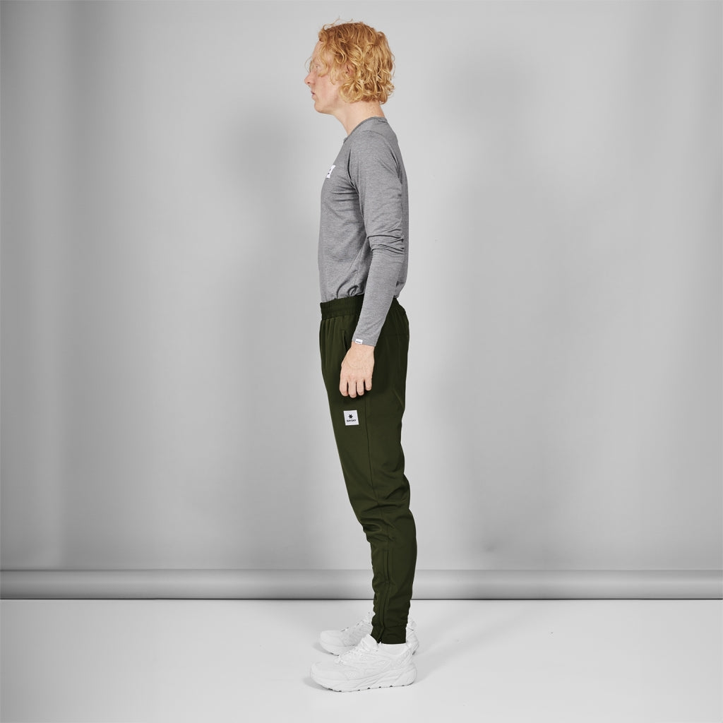 SAYSKYのBLAZEパンツはカジュアルな2レイヤーのランニングパンツです。ランニングで速く走れるようにデザインされており、外出先でもクールに見えるスタイルに仕上げています。膝から足首の袖口にかけて細くフィットするメンズスタイルのボトムスです。カラーはグリーンで、シルバーのリフレクティブで織られたSAYSKYのラベルと、ふくらはぎに小さなリフレクティブロゴがあしらわれています。