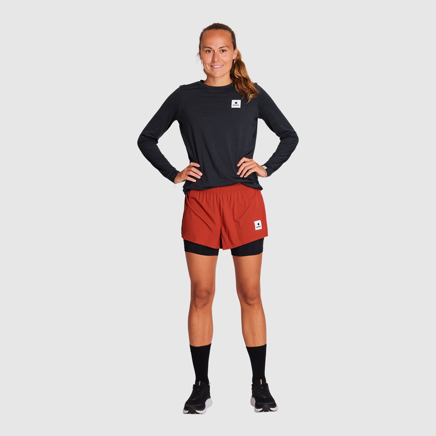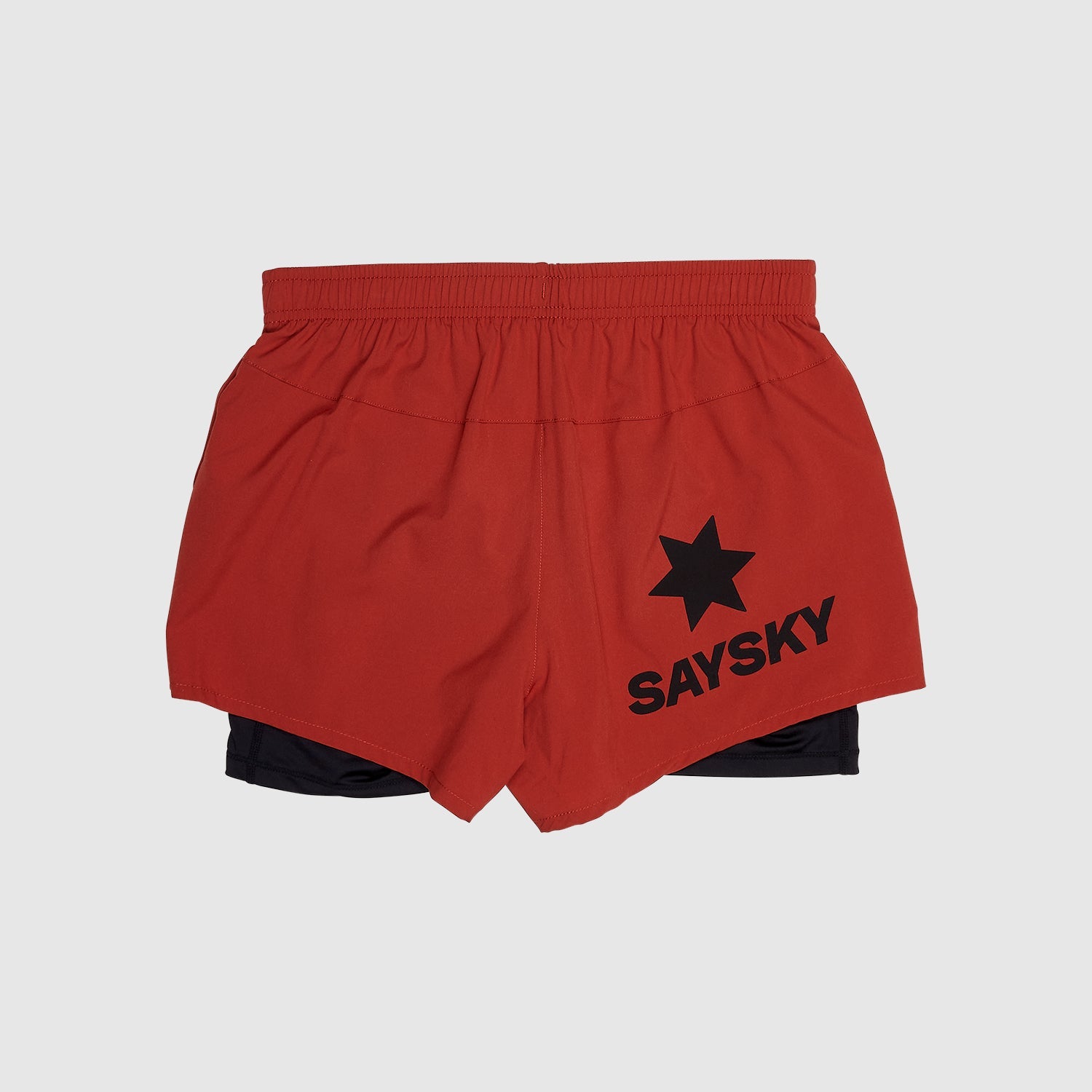 SAYSKYのウィメンズ・ペース 2-in-1ショーツ3インチ(7cm)はSAYSKYラインナップの中でも人気のスタイルです。アウターカラーはレッドで、インナーにはブラックカラーの長めのショーツを付けています。フロントにはホワイトカラーのロゴパッチ付き、バックサイドにはブラックカラーのSAYSKYロゴをプリントしています。レギュラーフィット設計で、ランニングはもちろんトレイルランニングやジムでの使用にも最適です。