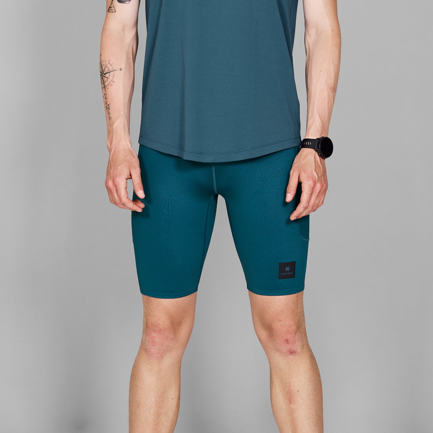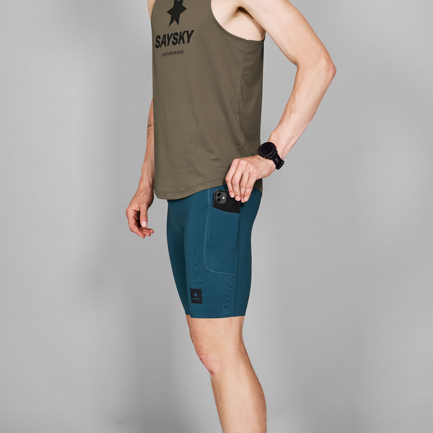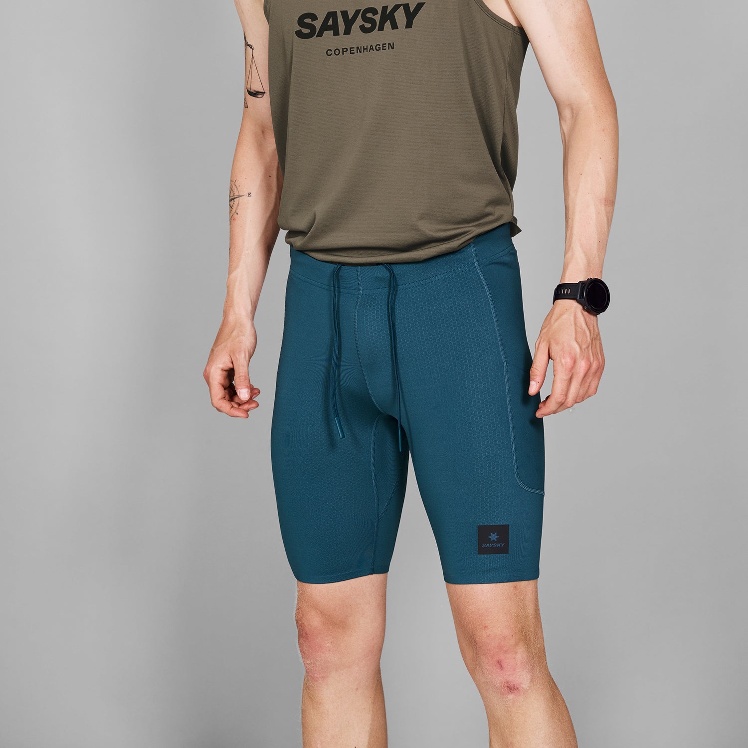 SAYSKYのメンズコンバット+ショートタイツ9インチ(22cm)は、リサイクルポリエステルを使用したランニング用ハーフタイツです。両サイドにポケットを付け、スマートフォンや補給食を携帯するのに役立ちます。ブルーカラーのボディで、サイドとウエストにはSAYSKYのロゴパッチを付けています。レギュラーウエストのスリムフィットなタイプです。このモデルはロングタイツの代わりとして、季節の変わり目での使用にとても適しています。
