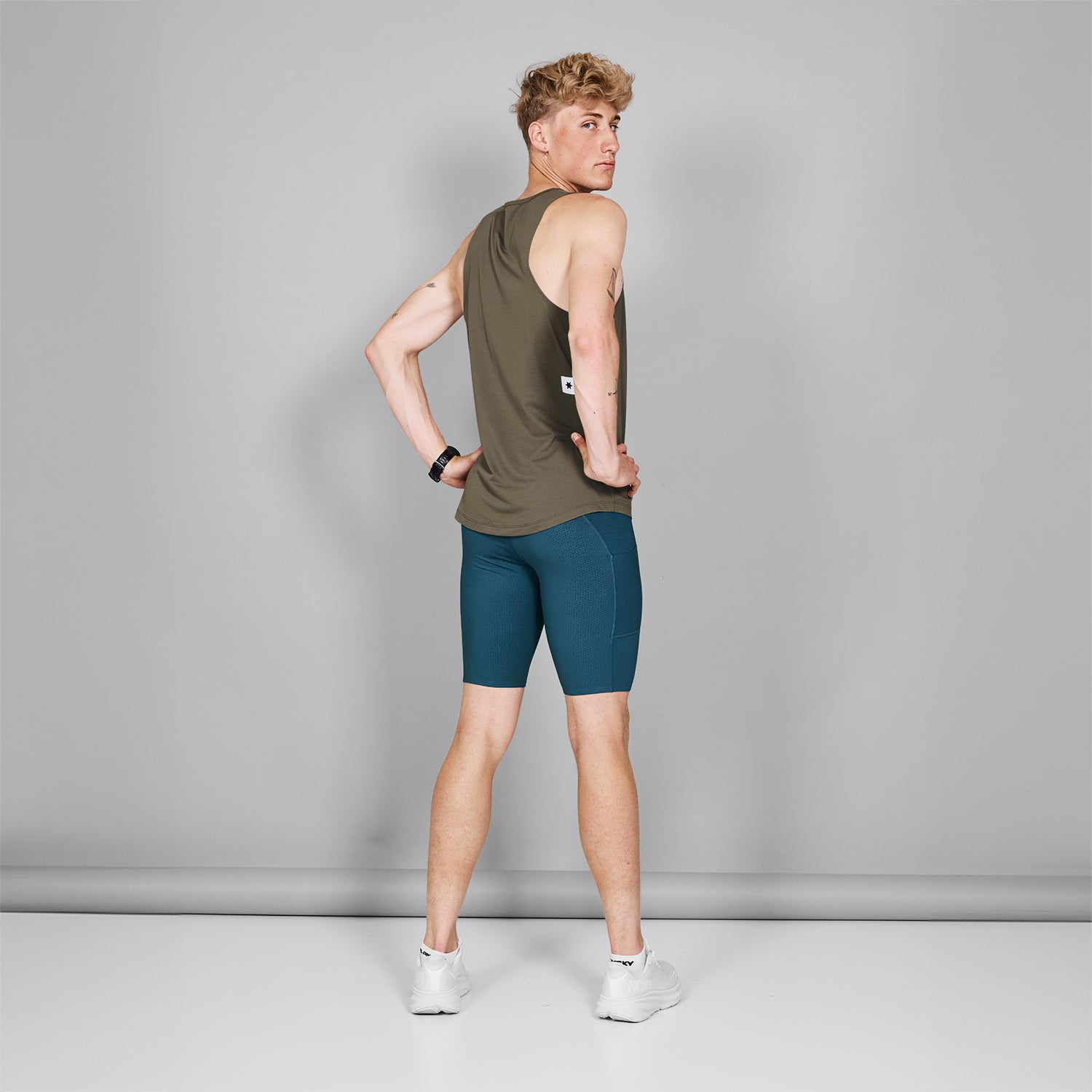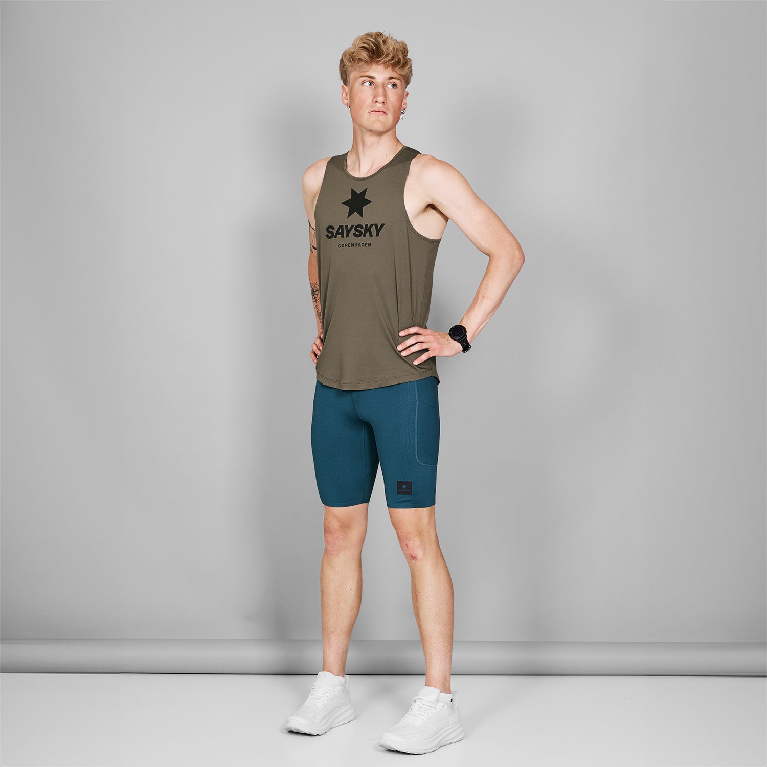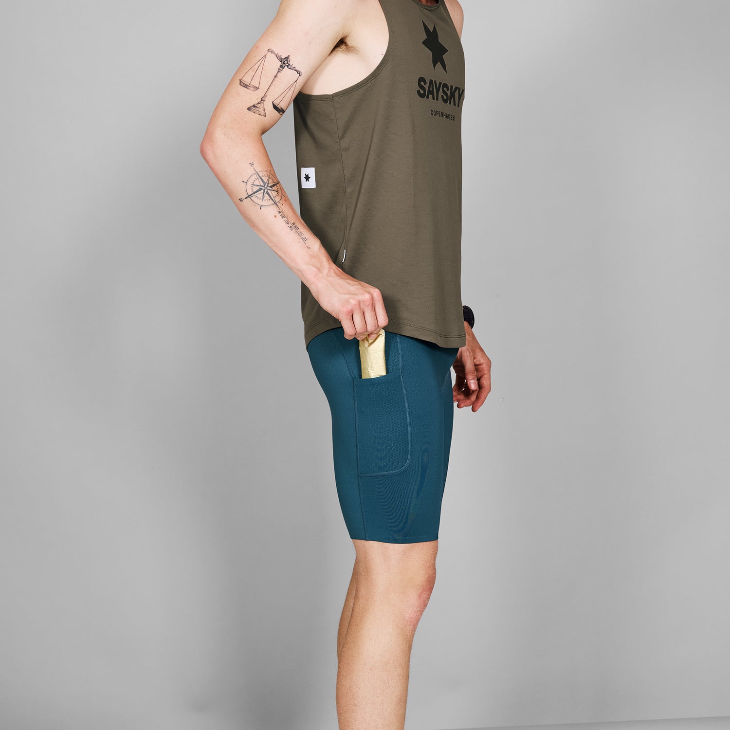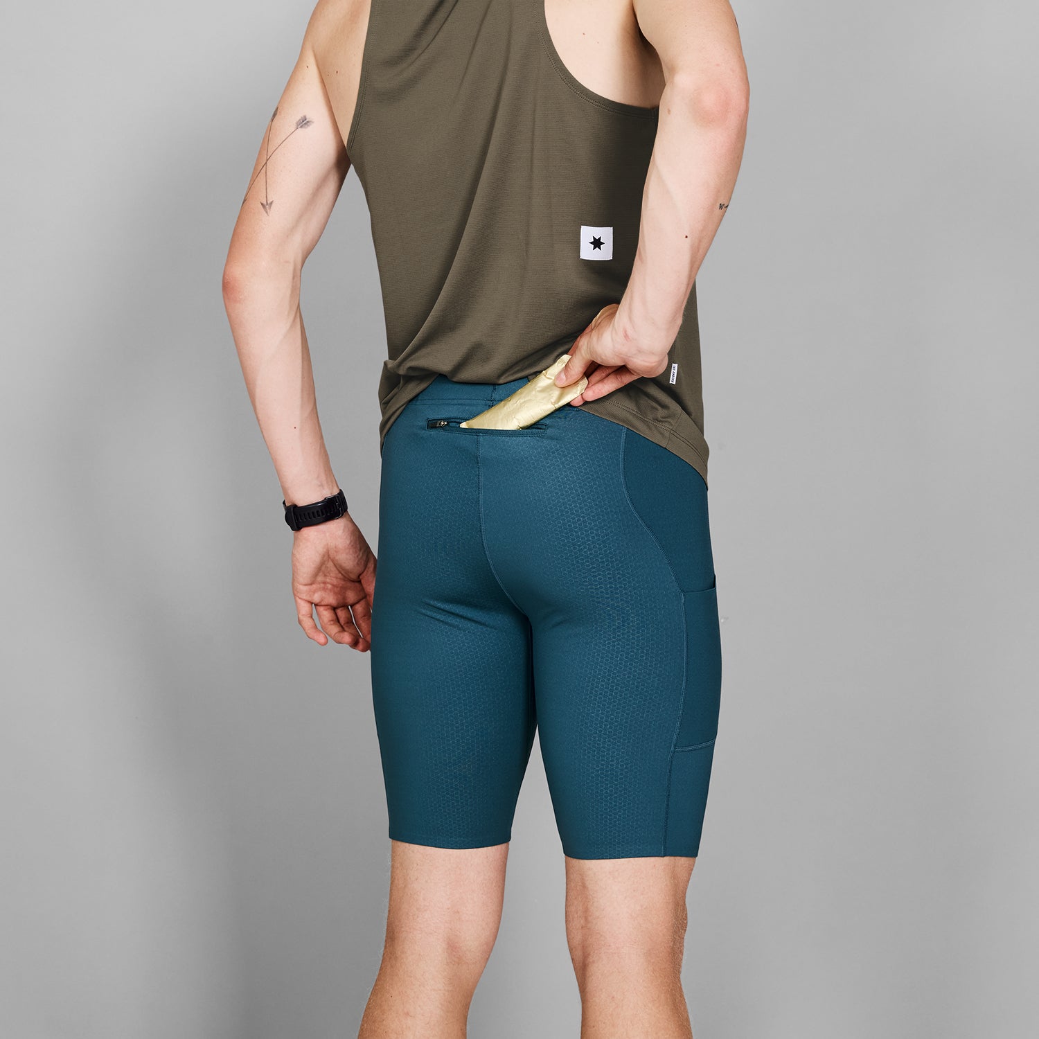 SAYSKYのメンズコンバット+ショートタイツ9インチ(22cm)は、リサイクルポリエステルを使用したランニング用ハーフタイツです。両サイドにポケットを付け、スマートフォンや補給食を携帯するのに役立ちます。ブルーカラーのボディで、サイドとウエストにはSAYSKYのロゴパッチを付けています。レギュラーウエストのスリムフィットなタイプです。このモデルはロングタイツの代わりとして、季節の変わり目での使用にとても適しています。