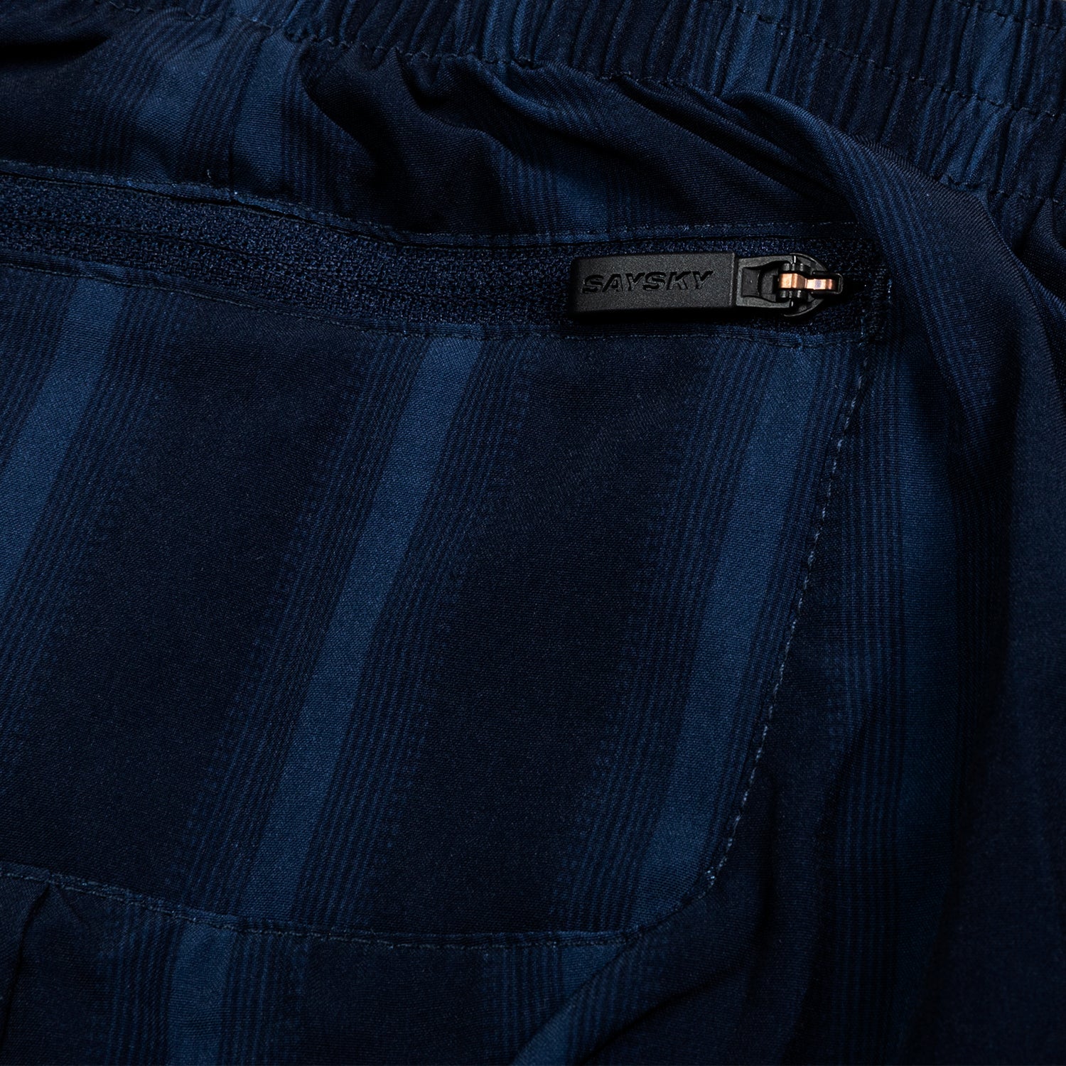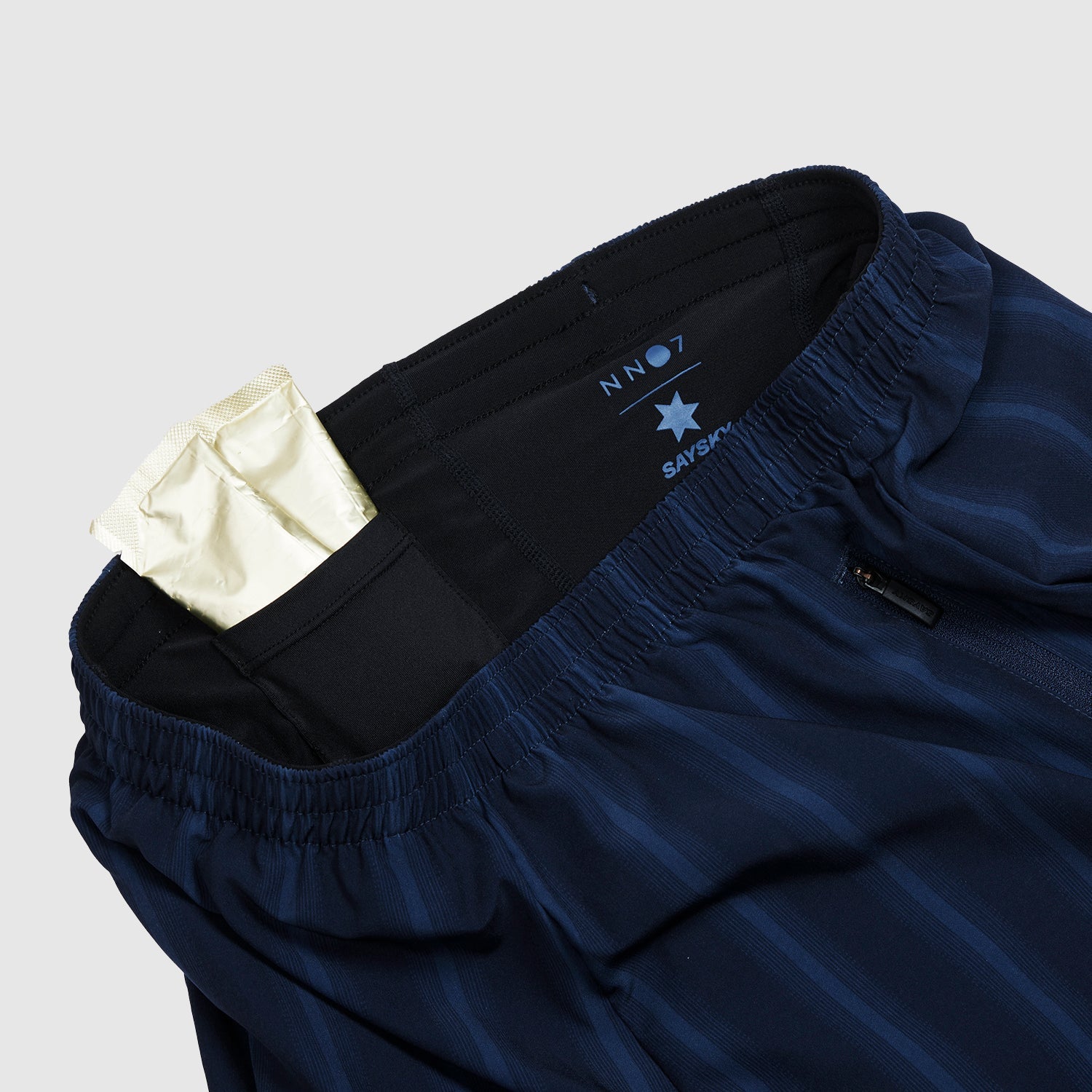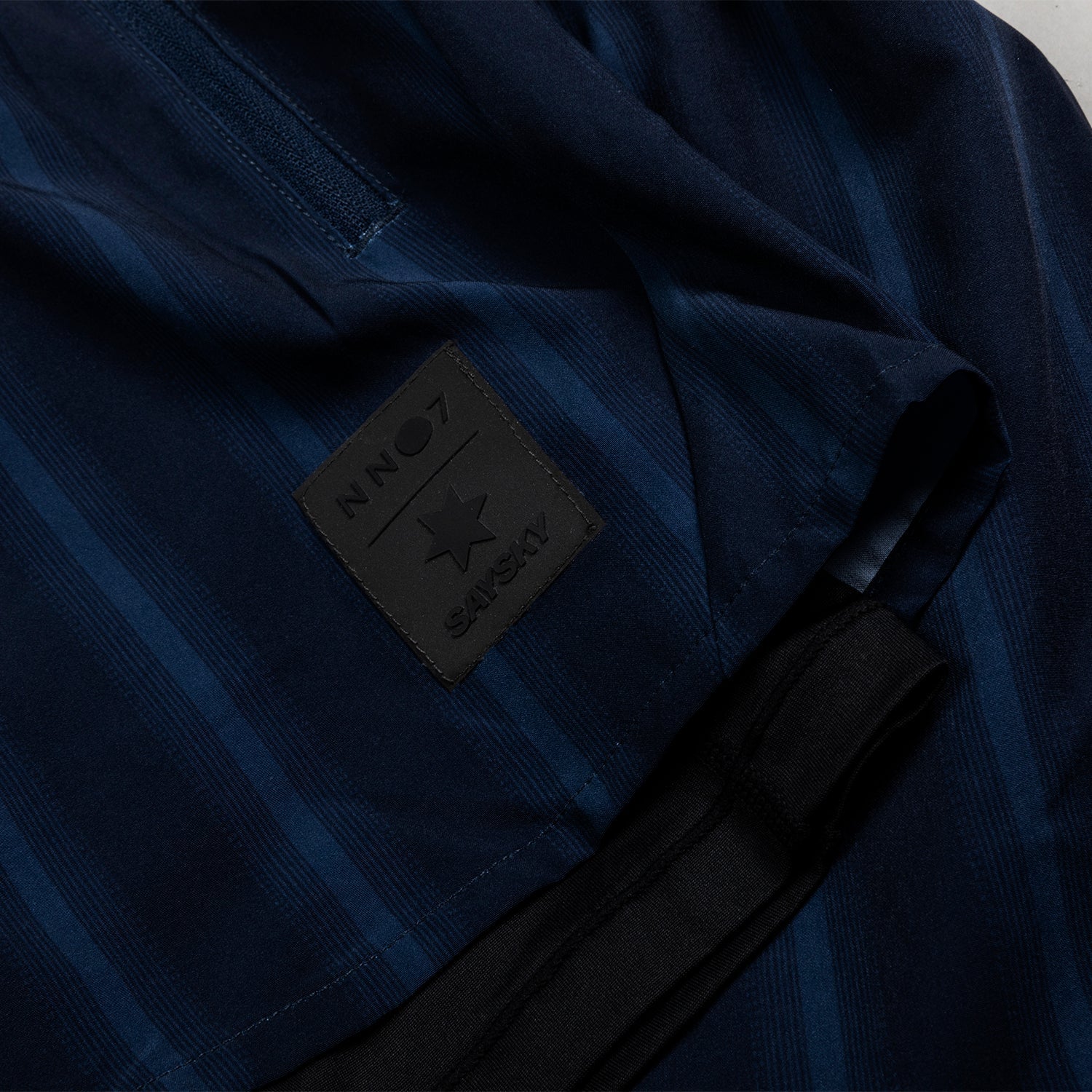 NN07 x SAYSKYの2-in-1ランニングショーツはSAYSKYラインナップの中でも人気のスタイルです。ネイビーカラーのベースにライトブルーのストライプをデザインしたショーツに長めのブラックインナータイツを付けています。フロントにはリフレクティブ仕様のNN07 x SAYSKYロゴパッチ付き。レギュラーフィット設計で、裾に向かって細身になるデザインで裾の羽ばたきを抑え、トレイルランニングにも適したスタイルです。ジップ付きのポケットがフロントサイドに2つ、バックに1つ付いています。